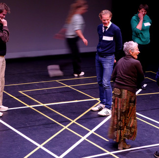 Schaminée vroeg zeven bezoekers om de theatervloer op te komen. Zij kregen ieder een andere rol: de gemeente, een bewoner die slecht ter been is, een klimaatbewuste fietser, een horecaondernemer, de manager van de Primark, het klimaat in de binnenstad en het kind. Met tape maakten ze om de beurt een vlak op de vloer, passend bij hun rol. Schaminée: ‘Het gaat om de ruimte die je inneemt en dan waar je staat binnen het vlak. Sta je aan de zijlijn of in het midden, en wat is je kijkrichting.’